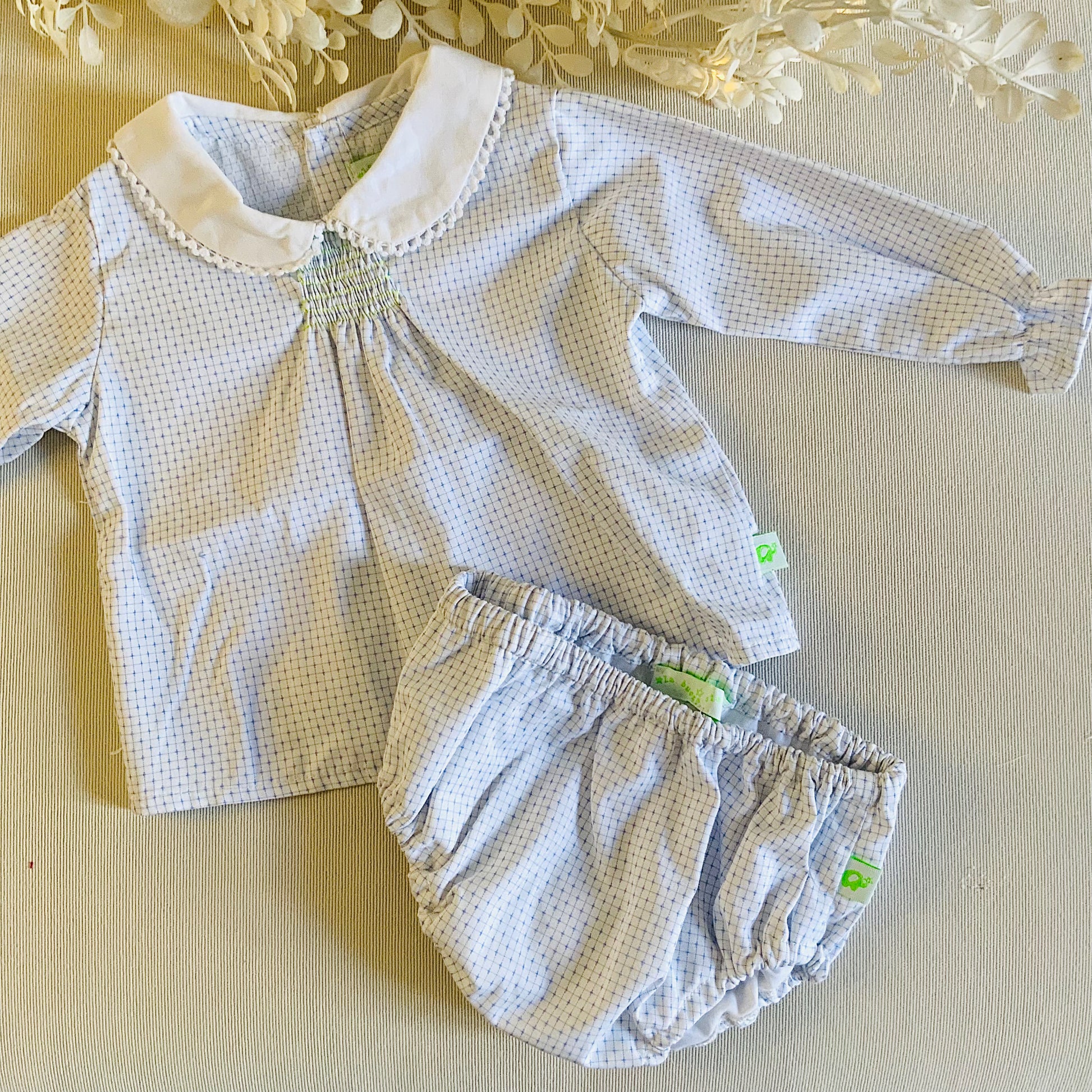 Blusa in microquadretto con arriccio nel centro davanti. Elastico nei polsi.