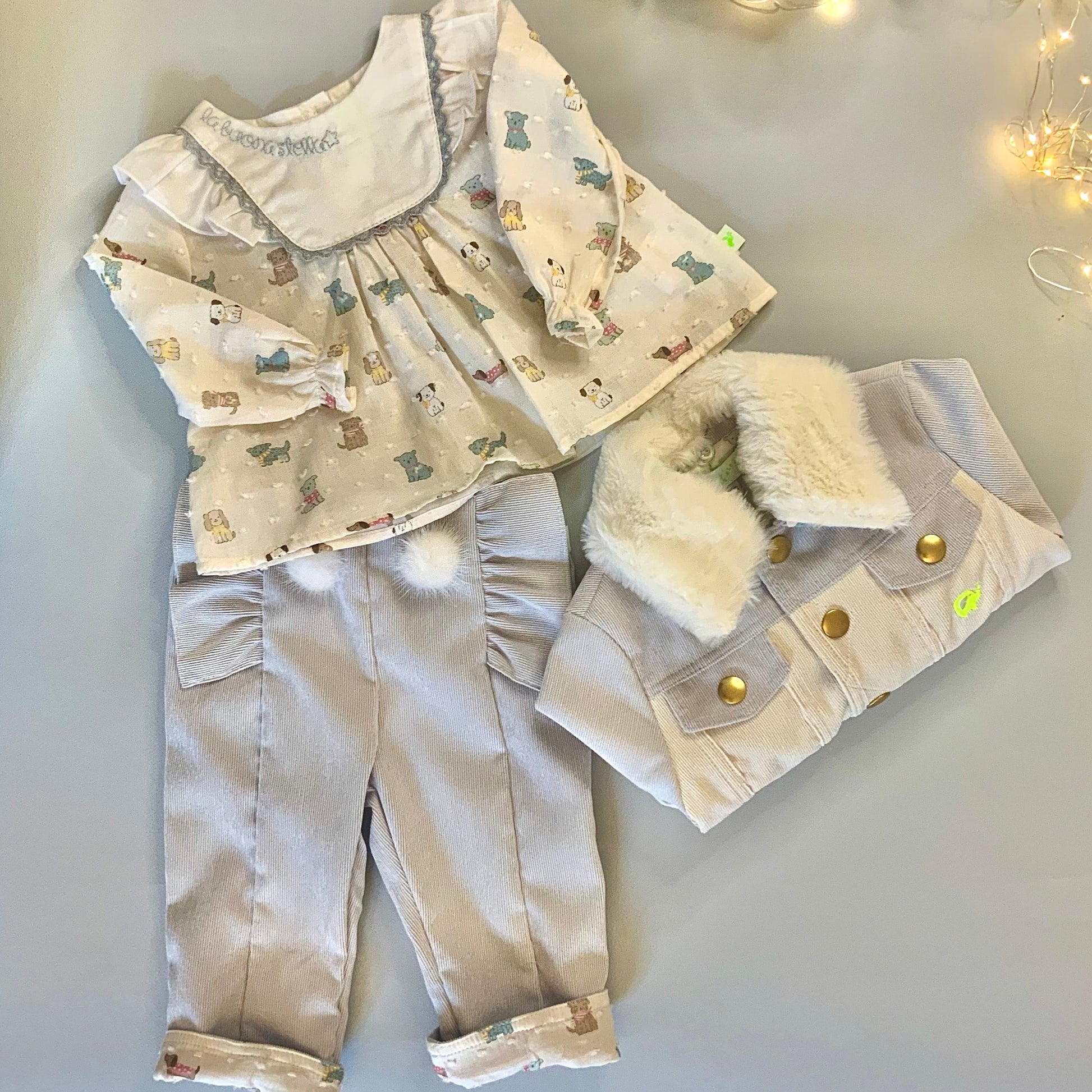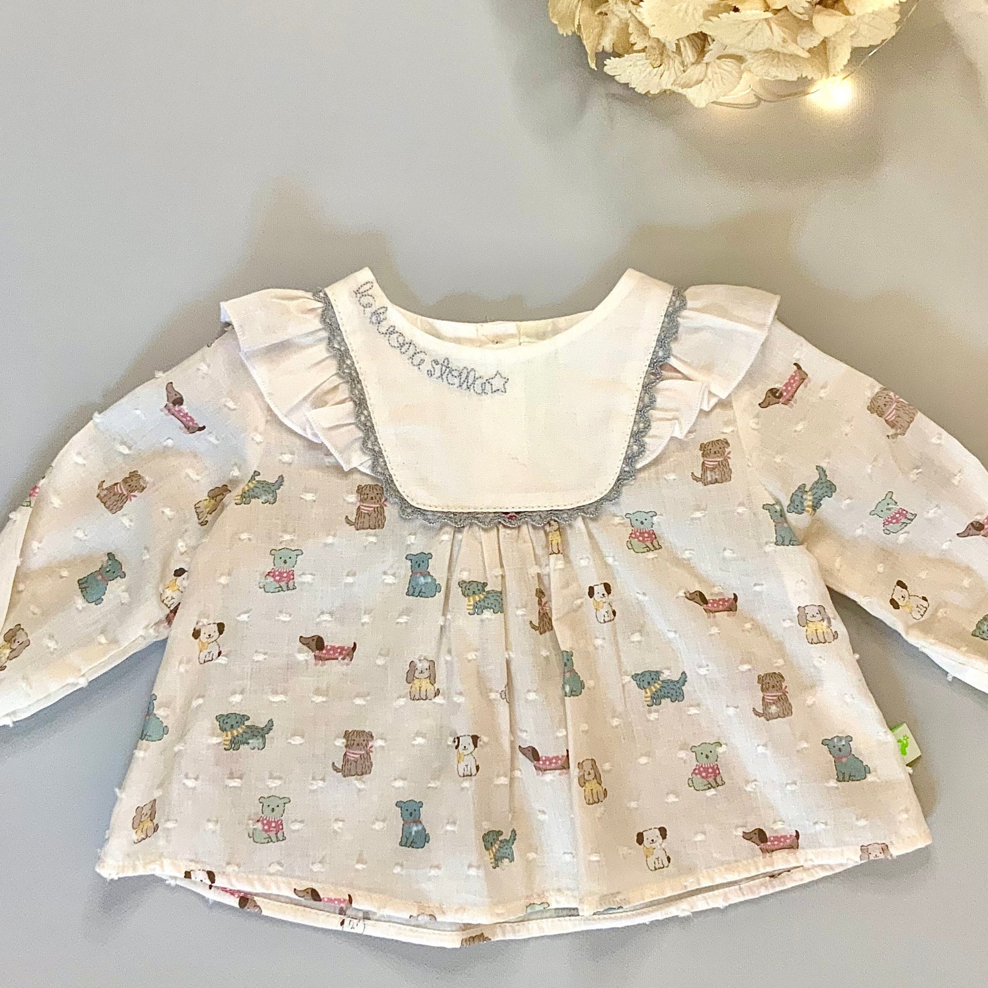 Camicia in plumetis stampato con pettorina ricamata e volant in Batista cotone. Polsini elastici. Chiusura dietro con bottoni madreperla.
