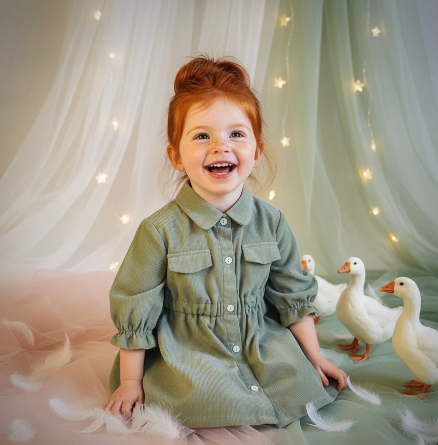 Vestito scamiciato da bambina in velluto rigato 100% cotone, realizzato artigianalmente in Puglia. Apertura davanti con bottoni madreperla, elastico in vita. Morbido e confortevole, con dettagli interni in fantasia floreale che donano un tocco di dolcezza. Disponibile nelle taglie da 3/6 a 18/24 mesi, è ideale per le stagioni più fresche.